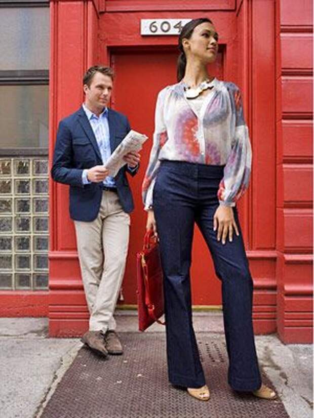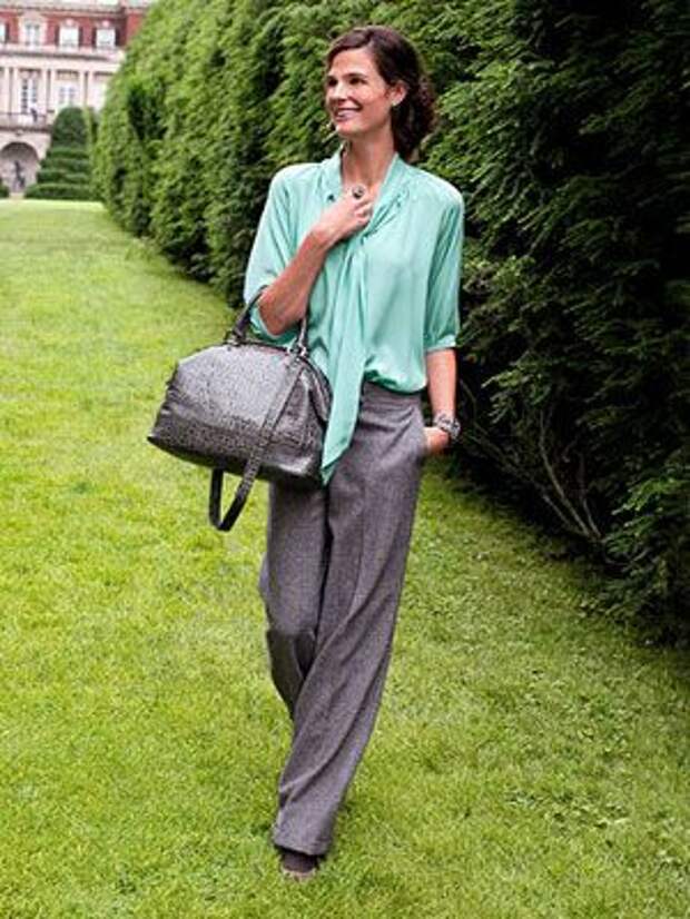 * Широкие брюки.Если вы действительно хотите выглядеть как леди, забудьте о джинсах-дудочках. В гардеробе элегантной женщины обязательно есть классические брюки прямого покроя. Они прекрасно сочетаются с шелковыми блузками, создавая образ а-ля Кэтрин Хэпберн.